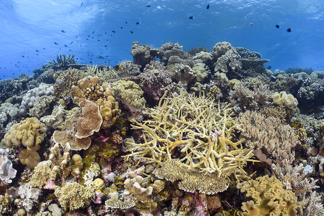 A popular shallow dive, and a favorite with wide-angle photographers, is the lagoon at Karang Kapota, where monolithic coral bommies rise from a white-sand seabed. Equally photogenic is Karang Kaledupa’s Rainbow Reef, which is a chain of seamounts connected by ridges. These formations make for dramatic wide-angle images, while the dense coral cover atop the ridges holds a wealth of macro subjects such as pygmy seahorses, and frogfish.