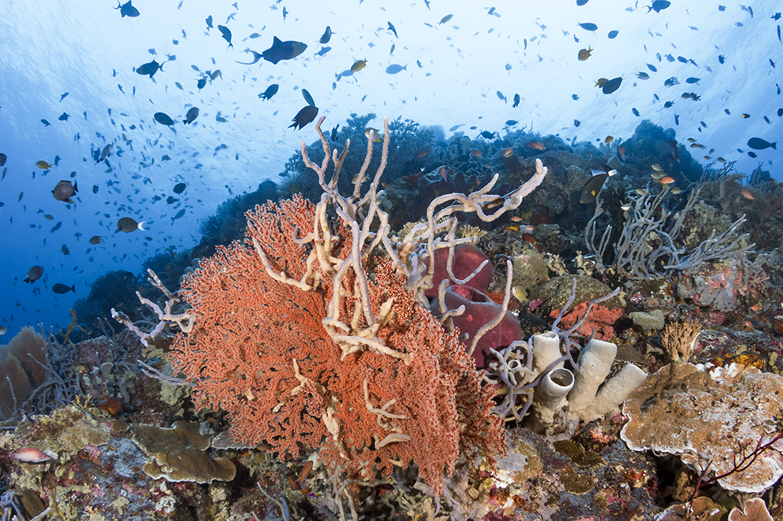 The dramatic vertical profile of Orange Wall is heavily decorated in soft corals and seafans and is capped by a pristine reef top overgrown with numerous varieties of hard coral. Colorful sea fans and sponges are also key features of the crests of the Hoga pinnacles, which rise from depths of 35 meters. The tops of these structures swarm with fusiliers, redtooth triggerfish, pyramid butterfly fish, and damselfishes.