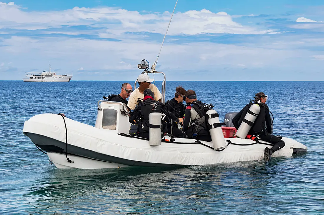 Ramon says that weekly cruise itineraries are customized to take advantage of the best seasonal conditions, and all trips are planned and adjusted according to weather, tides, currents, and the guests’ desired diving experience. Itineraries can also make accommodations for trips when there are snorkelers on board. “We have three DEMs on Pelagian,” Ramon says, “so we can take care of divers and snorkelers at the same time.”